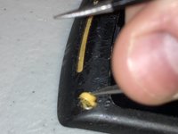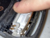As we look into the back of the phone again, you should see those pesky clips from step 7. We can take those little guys out! Just push on the back of it and use your fingernail to pull up on the gold bar. Now you can take out the volume button by pushing it on from the outside of the phone.