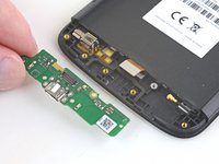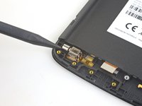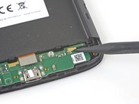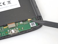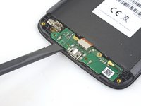 Insert the flat end of a spudger into the gap below the daughterboard and to the left of the charging port.
