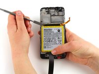 • Using the angled tweezers, disconnect the clip connecting the daughterboard to the battery by pulling the metal head vertically perpendicular to the phone.