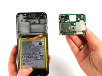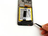 • Using the angled tweezers, detach the two connectors from the motherboard by pulling the metallic head vertically perpendicular from the phone.