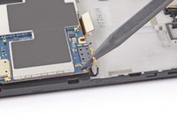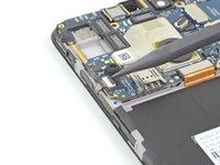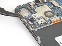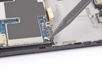 Use an opening tool to release the clip to the left of the motherboard flex cable.