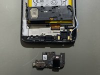 Lift up on the charing port board from the top and gently press down on the flex cable that is sitting under it. Remove from the phone frame.