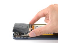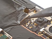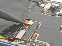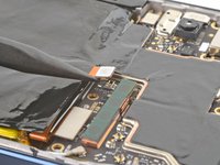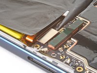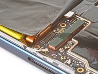 Lift and fold the graphite film off the battery and flip it onto the motherboard.