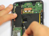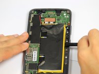 Using the spudger, cut downwards along the black tape on left side of the battery.