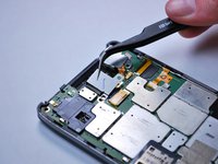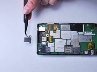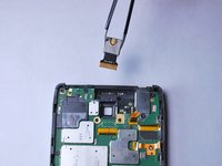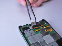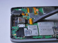 Use tweezers to gently remove the rear-facing camera by lifting it up off of the motherboard.