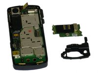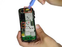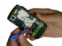 Use a plastic opening tool to gently lift up the SIM card reader, located above the rubber antenna casing. You should hear a click as it releases.