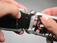 Depress the silver button with one hand and slide the back cover of the phone away from the antenna.