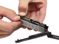 Lift the motherboard away from the case of the phone, being careful not to break the wire that goes up into the hinge.