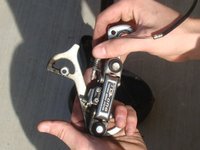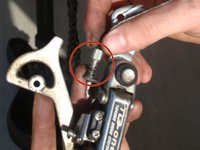 Rotate the derailleur arm forward to access the phillips head screw from the forwardmost sprocket. Remove the screw.