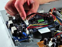 Unplug the pink and light blue attachments from the side of the brown board by pulling up on the tabs and gently pulling the cord out.