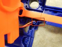Locate the orange bar protruding from the rest of the gun. You should see the spring hooked onto two ends.