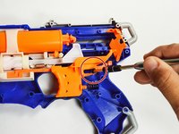 Locate the trigger mechanism's assembly, and notice that it's held in place by a single philip's head screw. Remove it.