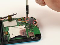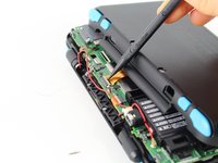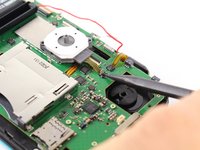 To more easily access this ribbon cable, flip the device so the back casing faces upwards. Gently slide the back casing forward, revealing the ribbon cable connecting to the motherboard.