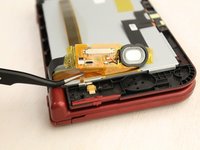 Use tweezers to flip up the small, hinged locking flap in order to unlock the ZIF connector securing the Circle Pad ribbon.