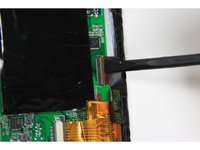 Using the flat end of the plastic spudger, open the black ribbon connector door on the right side of the motherboard.
