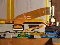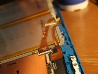 The power and volume ribbon cable leads to the buttons at the top right of the assembly. This strip of buttons has adhesive on the bottom and should be lifted up carefully as to not bend it.