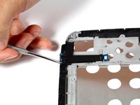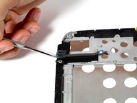 Using a plastic opening tool, remove the thin plastic cover from back of the tablet by prying up from its small tab.