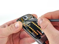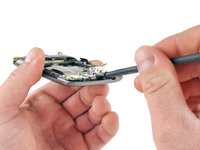 Using the plastic opening tools, pry the left bottom corner of the battery up.