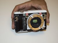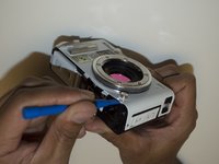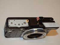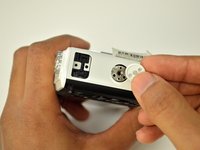 Press the flash pop-up button in the orange rectangle to be able to remove top cover of the camera.