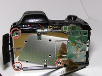 Remove two 5 mm Philips #000 screws on the left hand side of the camera located on the side where the batteries are inserted.
