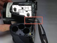 Unscrew the 4.0mm Phillips #000 screw located underneath the grey flap on the side of the camera with the "DC IN 5.0 V" marker.