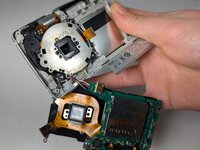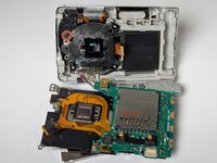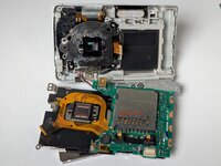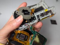 Using caution and a slightly firm hand, separate the camera into three parts: main body with lens, circuit board with screen, and the flash piece (pictured second).