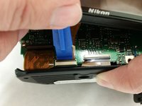 Lift the back of the camera and, using the blue prying tool, lift the tab from the LCD ribbon connector.