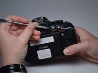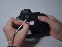 Gently pry back the rubber pad on the back of the camera with a metal spudger or other tool, or your fingernail, to reveal a hidden screw.