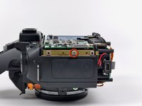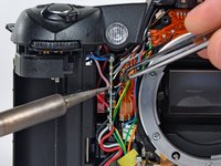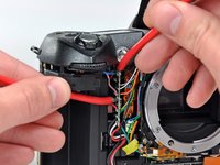 Carefully lift the top cover near the mode dial as you pull the mode dial ribbon cable away from the lens base.