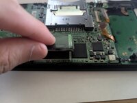 Hold onto the game cartridge slot and lift the board off the chassis.