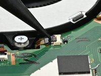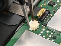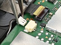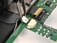 Use tweezers or your fingers to firmly grip the left speaker cable's white JST connector and pull straight away from its socket to disconnect it.