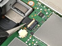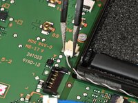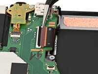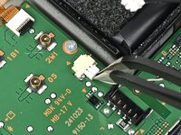 Use the point of a spudger to flip up the locking flap on the left Joy‑Con 2 connector cable ZIF connector, located next to the battery on the console's board.