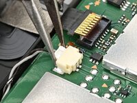Use tweezers or your fingers to firmly grip the right speaker cable's white JST connector and pull straight away from its socket to disconnect it.