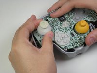 Grab the base of the grey joystick cover with one hand and firmly hold down the rest of the controller with the other hand.
