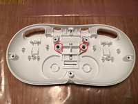 And now for the bigger, plain ol' L and R shoulder buttons. Remove the two silver screws holding the shoulder button assemblies to the rear panel.