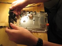 Remove all screws from the logic board cover. Two are recessed in the middle; others are along the edge. More will become visible as other parts are removed. It's like a game! You can start with the screws holding in the black plastic pieces, but I started with the most visible and went from there.