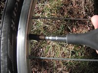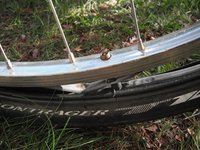 Release the tire's air by pressing a thin object on the center pin of the valve.