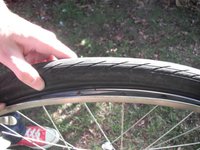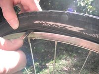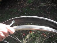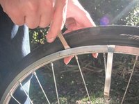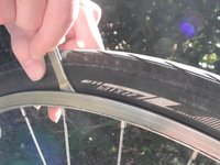Wedge a tire lever between the tire and the rim. Grab the tire with the lever's inward scoop.