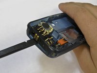 With one hand, press the ridged tab near the visible side of the SIM card.