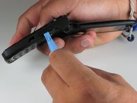 Use the iFixit opening tool to pry out the two tabs at the top corners of the battery compartment.