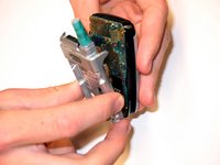 With caution, use a plastic prier to separate the back silver casing from the front of the phone. This may require force.