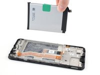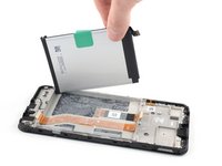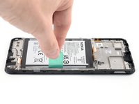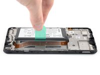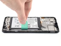 Using one hand to hold the phone steady, use your other hand to slowly and steadily lift the center green pull tab up to separate the adhesive securing the battery underneath.
