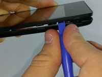 Push the plastic opening tool in between the screen and the back case of the phone.