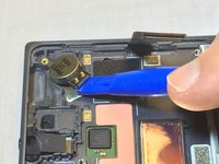 Then, use the plastic opening tool to lift up the the front facing camera, then remove completely with tweezers.
