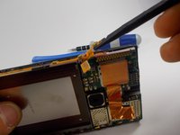 Using the plastic opening tool, pry up on the metal clip holding the battery in place.