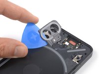 Carefully slide an opening pick underneath the camera cover and flash assembly to separate it from the motherboard cover.