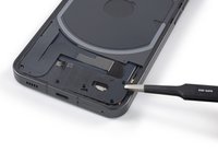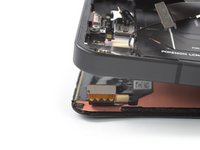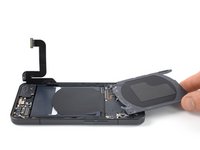 Carefully fold the charging coil to the top edge of the phone to access the motherboard cover screws.