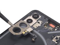 Use a pair of tweezers to carefully fold the camera cover and flash assembly toward the battery.