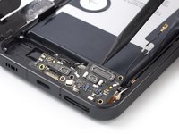 Push your tweezers toward the left edge of the phone to free the closure flap of the connector bracket.