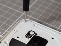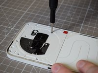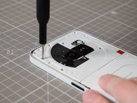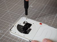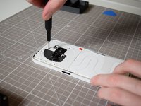 Locate that Phillips 00 screw that we placed to one side earlier, the one with the tiny white sticker on its head.